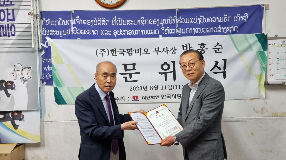 2023-08-11 작성자: 관리자 박홍순 한국팜비오 부사장 고문위촉 8월11일 한국사랑나눔공동체 이은덕 이사장은 박홍순 한국팜비오 부사장을 고문으로 위촉하고 위촉장을 전달하였다. 박홍순 고문께서는 평소 한국사랑나눔공동체에 많은 지원과 협력에 고문으로 모시게 되었습니다 박홍순 고문위촉1.jpg(325.75 KB)