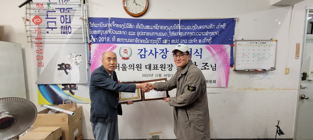 2023-12-01 작성자: 관리자 서울의원 정완조 대표원장에게 라오스 국가발전전선 감사장 전달 사단법인 한국사랑나눔공동체 이은덕 이사장은 11월 16일 서울의원 정완조 대표원장에게 라오스 국가발전위원회에서 보내온 감사장을 전달하는 수여식을 가졌다. 정완조 원장 감사장1.jpg(297.72 KB)