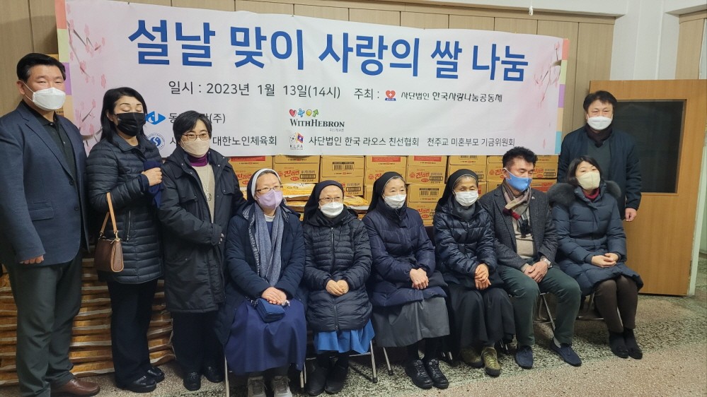 2023-02-20 작성자: 관리자 설날 맞이 사랑의 쌀나눔 행사 한국사랑나눔공동체 이은덕 이사장은 2023년 1월 13일 공동체 사무실에서 설날 맞이 사랑의 쌀나눔 행사를 가졌다. 설날맞이 사랑의 쌀나눔 행사에 동화제관, 위드헤브론, 서울대교구 미혼모기금위원회, 한국 라오스틴선협회, 대한노인체육회가 후원하였고, 양주시 다문화가족지원센터, 성모소화의집, 성보나의집, 행복한 교회등에 지원하였 사랑의쌀나눔.jpg(361.5 KB)