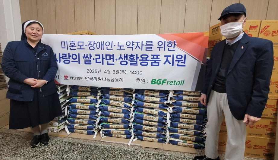 2025-04-07 작성자: 관리자 BGF retail 후원 사랑의 쌀, 라면 나눔행사 2025년 4월 3일 14시 (사)한국사랑나눔공동체 이은덕 이사장은 BGF retail 후원으로 미혼모, 장애인, 노약자를 위한 사랑의 쌀, 라면을 지원하는 나눔행사를 하였다. 미혼모 장애인 지원 0403.jpeg(187.75 KB)