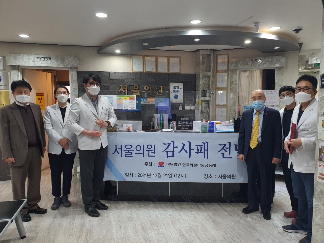 2021-12-29 작성자: 관리자 감사패 전달식 2021년 12월 21일 (사)한국사랑나눔공동체 이은덕 이사장은 서울의원 정완조 원장을 방문하여 지속적인 후원에 감사하는 마음을 담아 감사패를 전달하였습니다.