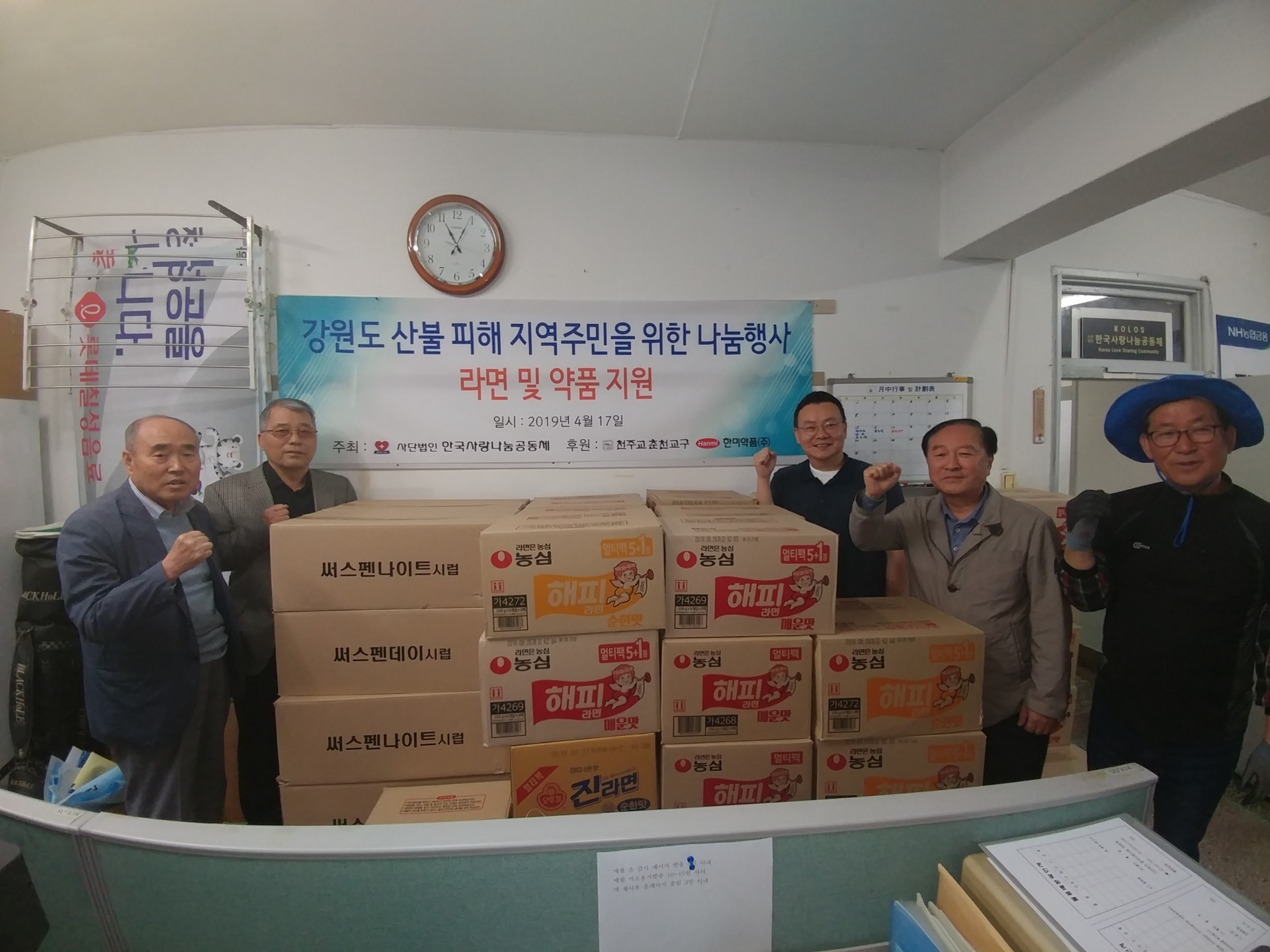 2019-04-29 작성자: 관리자 강원도 고성, 속초 산불 이재민을 위한 지원 2019. 04. 17. 19. (사) 한국사랑나눔공동체(이사장 이은덕)는 강원도 고성, 속초 일대 대형산불로인한 이재민을 위하여 (주) 푸르밀, 한미약품(주) 의약품, 라면등 후원물품을 천주교 춘천교구(김운회 주교)를 통하여 전달하였다