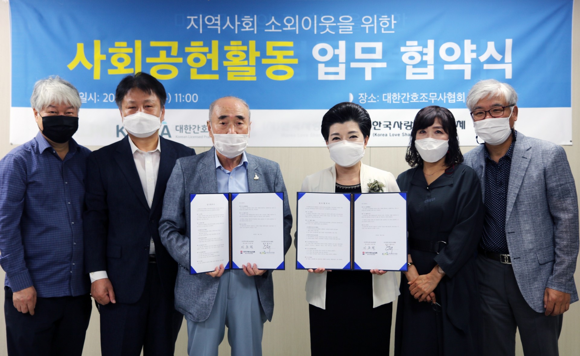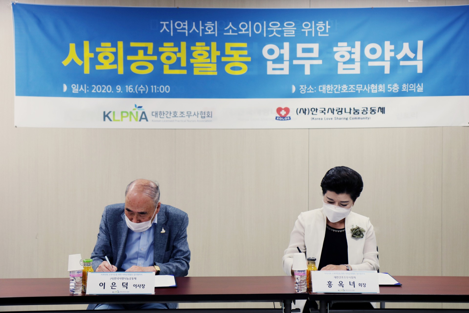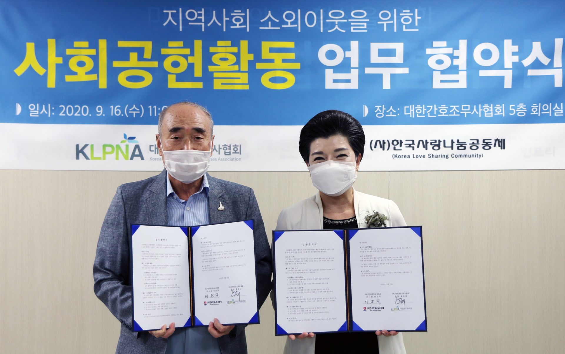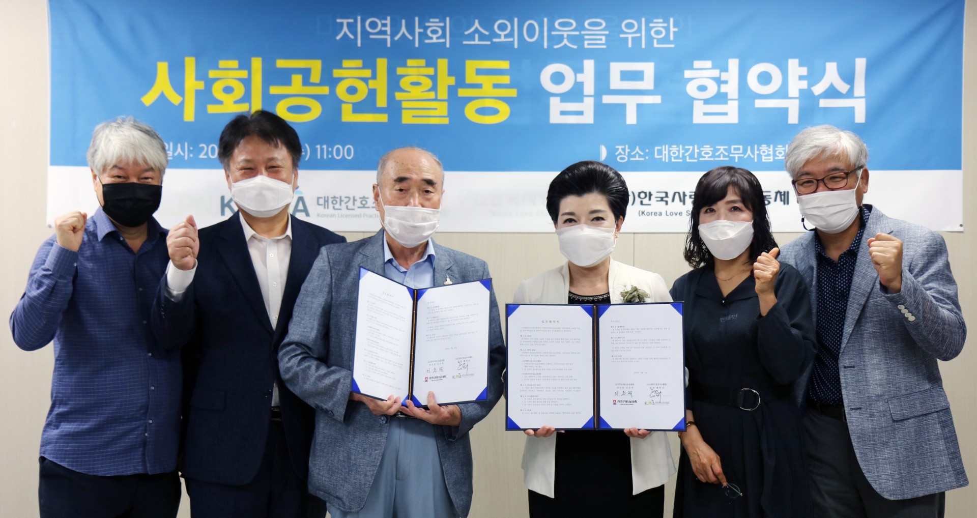 2020-09-21 작성자: 관리자 대한간호조무사협회와 업무협약 (사)대한간호조무사협회와 (사)한국사랑나눔공동체는 지역사회의 소외된 이웃을 위한 복지향상을 위하여 상호협력하기로 2020. 09. 16 (사)대한조무사협회 회의실에서 협약하였다.