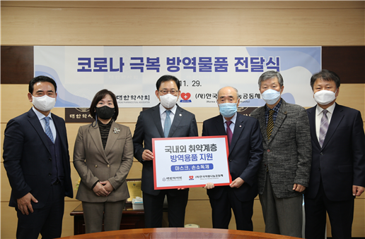 2022-12-06 작성자: 관리자 대한약사회, 한국사랑나눔공동체에 복지시설 방역용품 전달 대한약사회(회장)가 한국사랑나눔공동체(이사장 이은덕)에 사회복지시설을 위한 코로나 방역용품(1,500만원 상당의 KF94마스크와 손소독제)을 전달했다. 11월 29일 대한약사회관에서 열린 전달식에서 최광훈 회장(윈쪽 세번째)과 이은덕 이사장(오른쪽에서 세번째) 등이 기념 촬영하다 이날 전달식에는 한국사랑나눔공동체 최광훈 회장, 최미영 부회장, 박상용 홍보이사, 최두주 사무총장, 한국사랑나눔공동체 이은덕 이사장, 도재식 상임이사 등이 참석했다. 대한약사회-사진.png(253.51 KB)