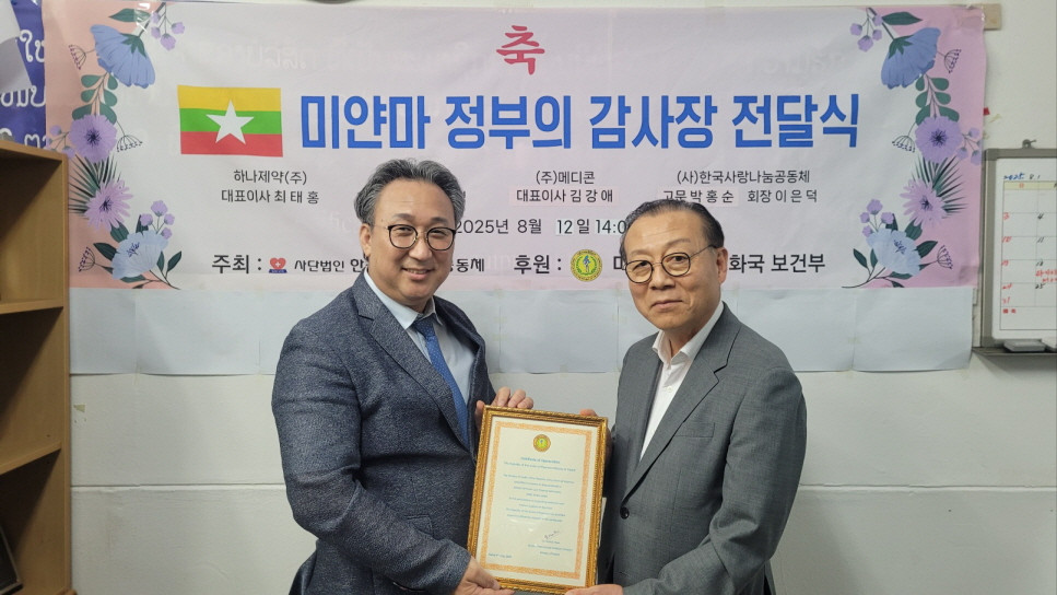 2025-08-12 작성자: 관리자 미얀마 정부의 감사장 전달식 8월12일 (사) 한국사랑나눔공동체 이은덕 이사장은 5월~7월 기간 동안 미얀마 정부에 의약품 및 의료기기를 지원한 하나제약(주), Lino(주), (주)메디콘, 대표이사 및 한국사랑나눔공동체 박홍순 고문에게 미얀마 연방공화국 보건부로 부터 감사장을 전달받아 전달식을 하였다. 미얀마 감사장 사진1.jpg(277.21 KB)