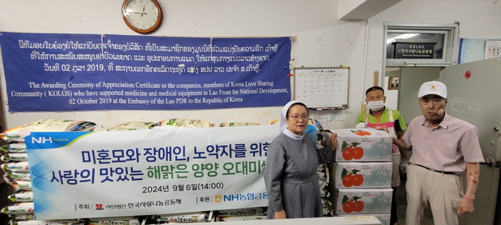 2024-09-23 작성자: 관리자 미혼모와 장애인 노약자를 위한 사랑의 맛있는 해맑은 양양오대미쌀 지원 2024년 9월 6일 14:00 사단법인 한국사랑나눔공동체 이은덕 이사장은 미혼모와 장애인 노약자를 위한 사랑의 맛있는 해맑은 양양 오대미쌀을 NH농협금융지주로 부터 협찬 받아, 동트는마을등 장애인 시설등에 지원 하는 행사를 가졌다. 오대미.jpg(312.57 KB)