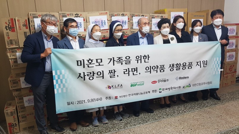 2021년 9월 8일 14:00 한국사랑나눔공동체(이사장 이은덕)는 한국병원약사회 이영희회장, 대한강호조무사협회 홍옥녀 회장, 한라오친선협회 이상미 실장, 자오나학교 수녀님, 성모소화의집 수녀님 등이 참석한 자리에서 코로나19로 고통받는 미혼부모, 아동청소년 보호시셀등에 쌀, 라면, 생활용품 및 의약품을 전달하였음.