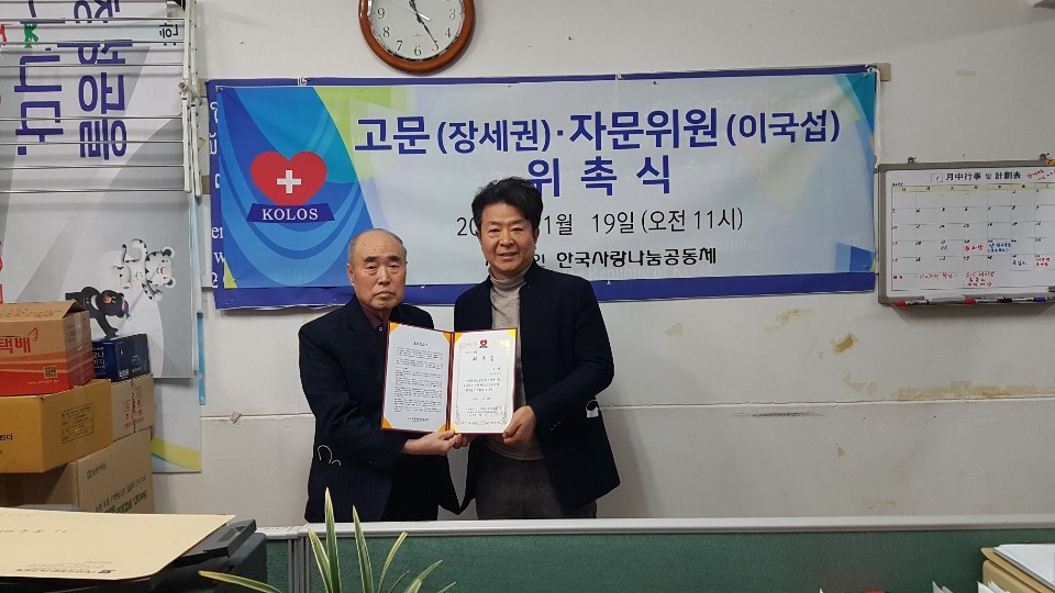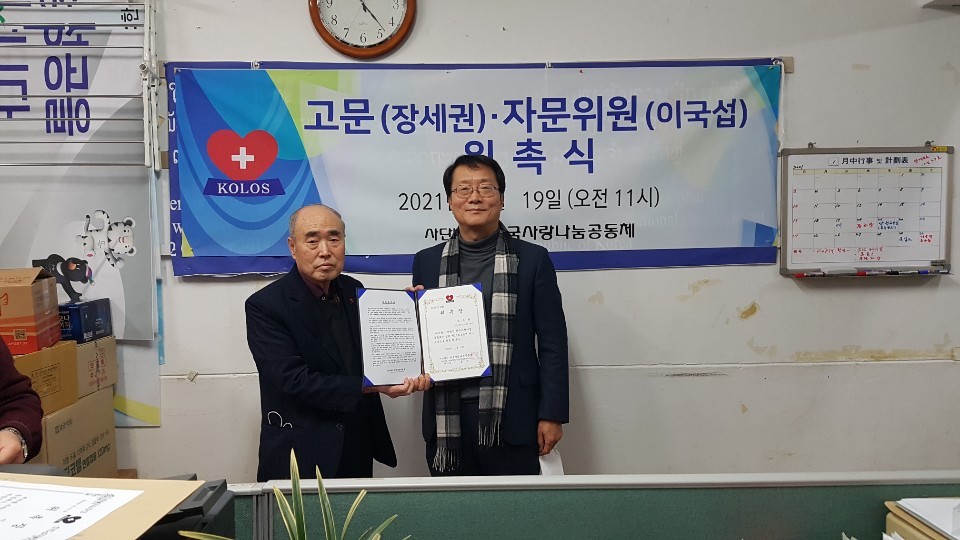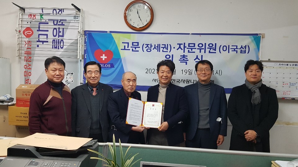 2021-02-01 작성자: 관리자 법인 고문 및 자문위원 위촉식 행사 2021. 1. 19 11:00 (사)한국사랑나눔공동체(이사장 이은덕)는 장세권((주)경우시스테크 사장)님께 고문 위촉 및 이국섭(하모니 사장)님께 자문위원으로 위촉행사를 하였다.