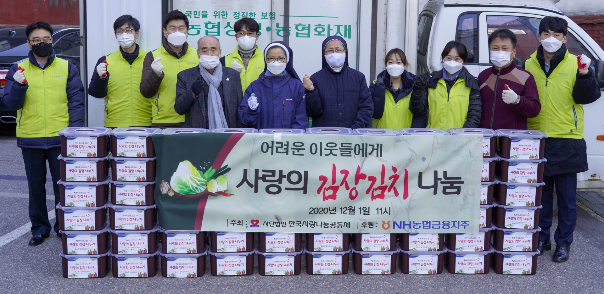 (사)한국사랑나눔공동체(이사장 이은덕)는 2020.12.01. 10:30 NH농협금융지주 후원으로 어려운 이웃들에게 사랑의 맛있는 김장김치 나눔 행사를 농협금융지주 직원들과 미혼모시설 자오나학교, 샛별자리등 20개 시설 관계자들과 함께 하였다