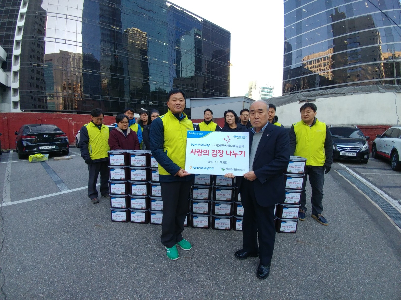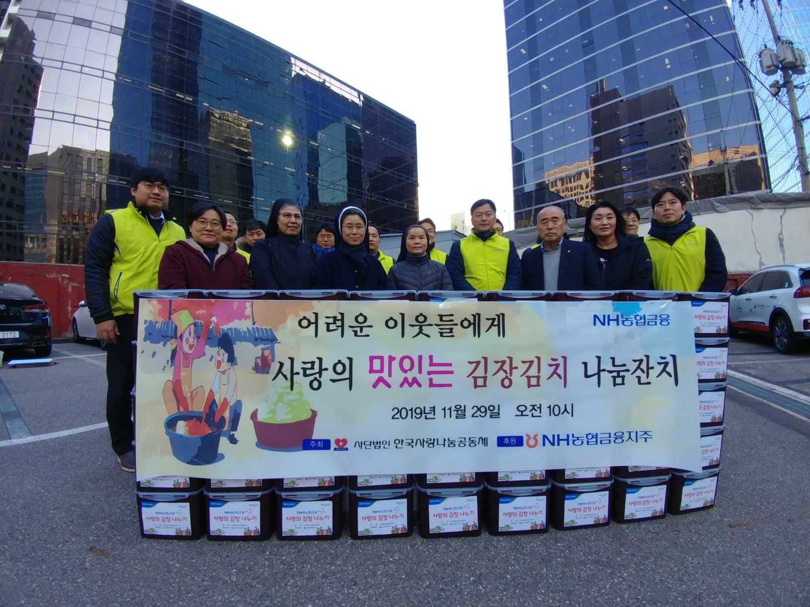 2019-11-29 작성자: 관리자 사랑의 맛있는 김장김치 나눔잔치 (사)한국사랑나눔공동체(이사장 이은덕)는 2019. 11. 29 10:30 NH농협금융지주 후원으로 어려운 이웃들에게 사랑의 맛있는 김장김치 나눔 잔치를 농협금융지주 직원들과 미혼모시설 자오나학교, 샛별자리등 35개 시설 관계자들과 함께하였다.