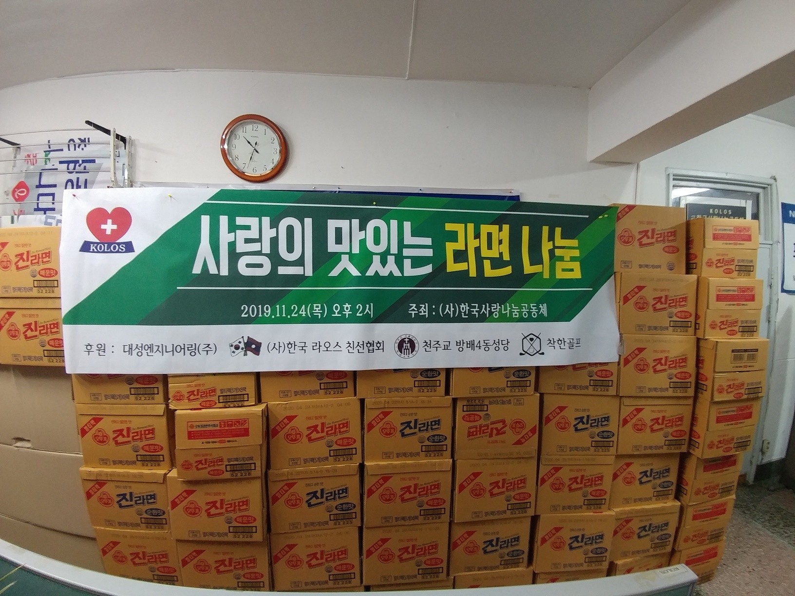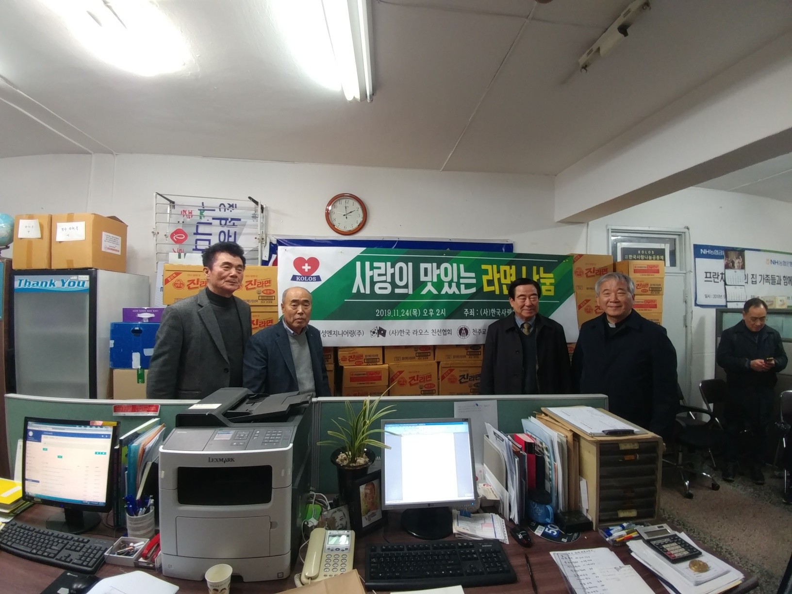 2019-11-21 작성자: 관리자 사랑의 맛있는 라면나눔 (사) 한국사랑나눔공동체(이사장 이은덕)는 2019. 11. 21 14:00 법인사무실에서 방배4동 이동익 주임신부님, 최일경 고문님, 한라오스친친선협회 오명환 회장님과 자오나학교, 성보나의집, 성빈센트청년회, 샛별자리, 빛나는작업장 수녀님과 함께 사랑의 맛있는 라면나눔행사를 가졌다.