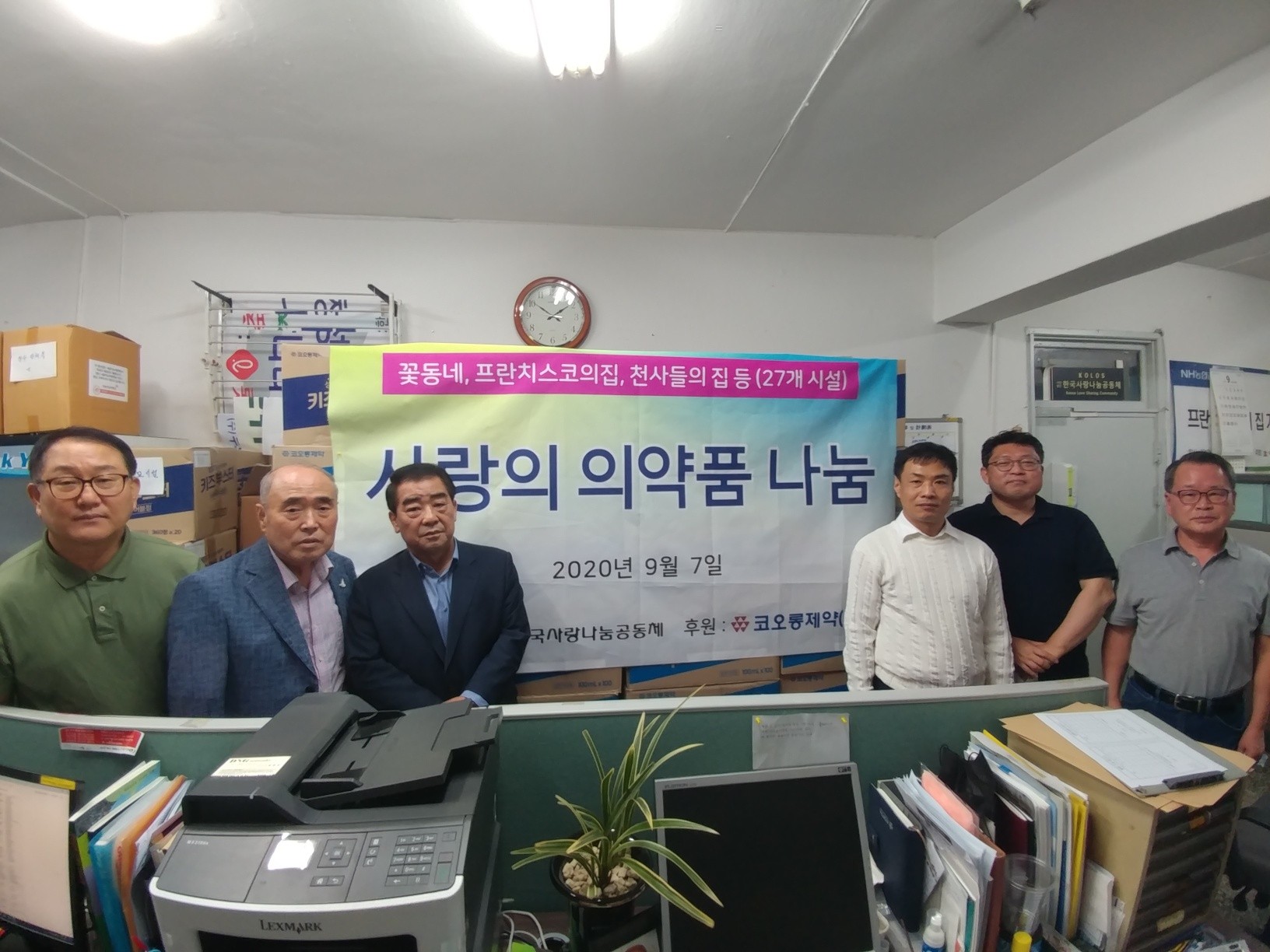 2020-09-11 작성자: 관리자 사랑의 의약품 나눔 2020. 9. 7 (사) 한국사랑나눔공동체(이사장 이은덕)는 코오롱제약에서 후원받은 약품을 꽃동네, 프란티스코의집, 천사들의집 등 27개 시설에 전달할 예정이다.