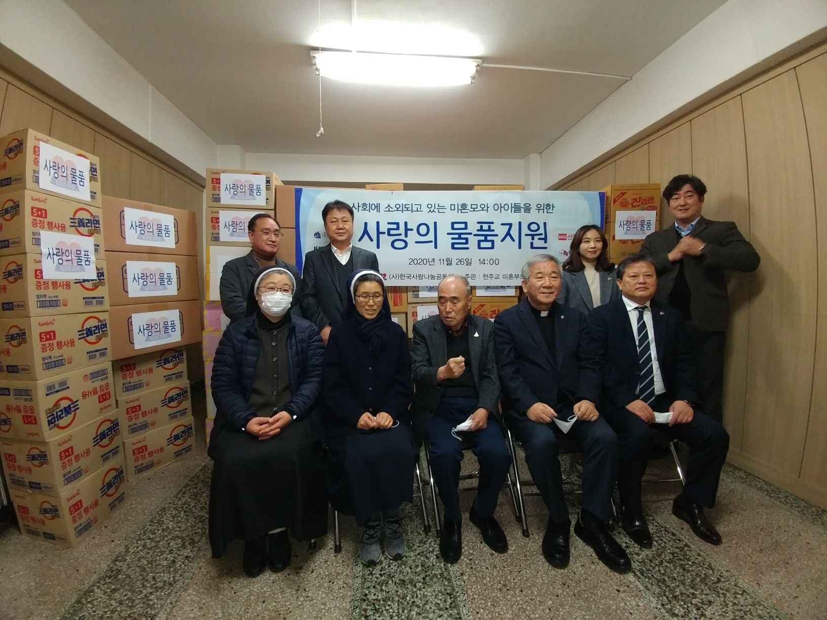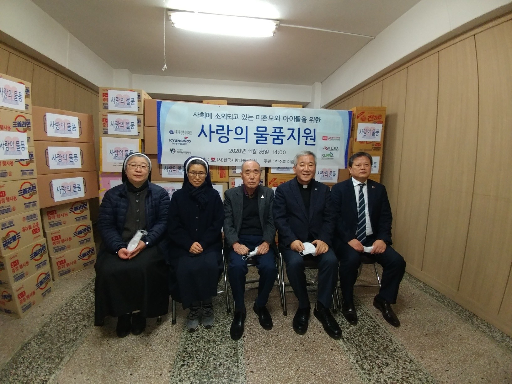 2020-11-30 작성자: 관리자 사회에 소외된 미혼모와 아동들을 위한 사랑의 물품 지원 (사) 한국사랑나눔공동체(이사장 이은덕)와 천주교 미혼부모후원회(이동익 신부)는 지난 26일 한국사랑나눔공동체 사무실에서 미혼 부모와 아동을 위한 사랑의 의약품, 생필품 전달식을 하였다. 후원사는 대성엔지니어링, 선엔지니어링건축사사무소, 지구촌보건복지, 한국 - 라오스친성협회, 대한간호조무사협회, 경우시스테크와 함께했다.