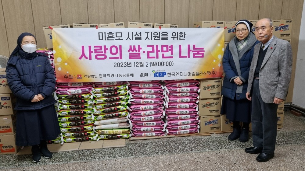 2023-12-21 작성자: 관리자 성탄맞이 미혼모를 위한 사랑의 쌀, 라면 생활용품 지원 (사)한국사랑나눔공동체 이사장 이은덕은 12월 21일 14시 성탄맞이 미혼모 가족을 위한 사랑의 쌀 라면등을 한국엔지니어링프라스틱(ㅈ누) 협찬으로 성보소화의집, 자오나학교 등 27개 시설 및 극빈자에게 지원하였다. 한국엔지니어링플라스틱(주)1.jpg(426.52 KB)