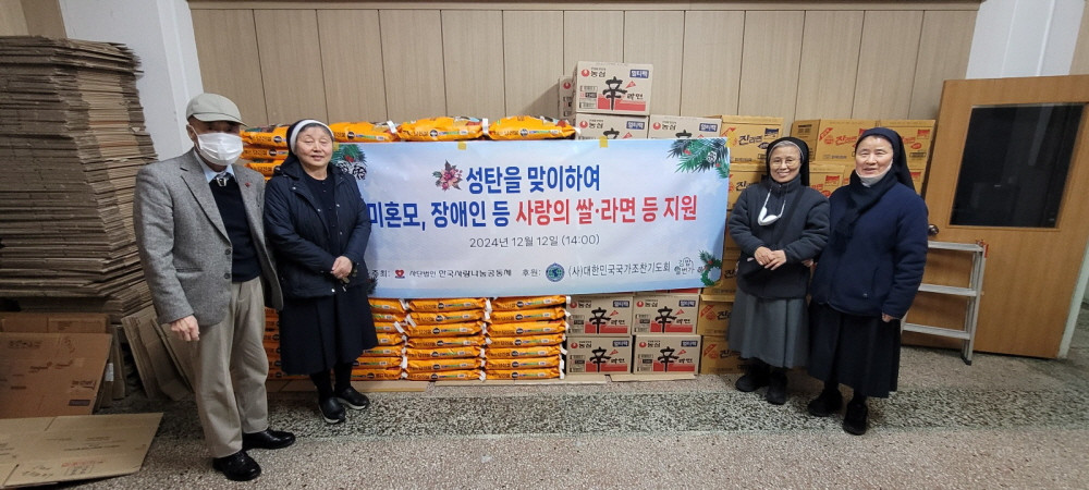 2024-12-17 작성자: 관리자 성탄을 맞이하여 미혼모, 장애인 등 사랑의 쌀 라면 등 지원 (사)한국사랑나눔공동체 이은덕 이사장은 공동체 사무실에서 (사)대한민국국가조찬기도회(이봉관 회장)로 부터 쌀, 라면(약1,000만원)지원받아 자오나학교, 성모소화의집 등 미혼모, 장애인 시설에 사랑의 쌀, 라면 생활용품 등을 지원 차가운 날씨에 따뜻한 행사를 가졌다. 조찬기도회 후원.jpg(324.11 KB)