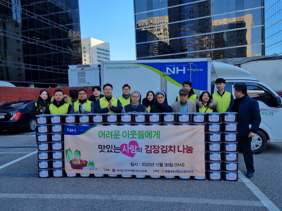 2022-12-06 작성자: 관리자 어려운 이웃들에게 맛있는 사랑의 김장김치나눔 행사 (사) 한국사랑나눔공동체(이사장 이은덕)는 2022년 11월 30일 10:30 NH농협금융지주 후원으로 어려운 이웃들에게 맛있는 사랑의 김장김치 나눔행사를 가졌다 NH 농협금융지주 직원들이 참석하여 미혼모시설 자오나학교, 성모 소화의집 등 20여개 시설에 나눔 봉사에 참여하였다. 김치나눔행사-농협1.jpg(518.42 KB)