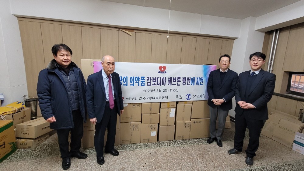 2023-03-07 작성자: 관리자 유유제약 캄보디아 헤브론병원에 의약품 전달 2023년 3월 2일 한국사랑나눔공동체에서 이은덕이사장, 도재식 상임이사, 유유제약 천경석 본부장이 참석하여 캄보디아 헤브론병원에 유유제약 의약품을 후원하는 전달식을 가졌다. 유유제약.jpg(347.68 KB)