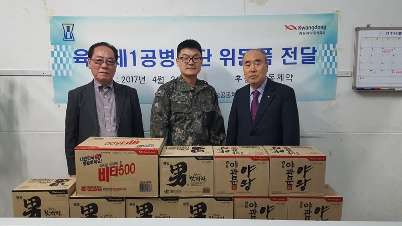 한국사랑나눔공동체는 공동체 사무실에서 광동졔약(주)에서 후원한 후원물품을 육군 제1 공병여단앞 전달하였다.