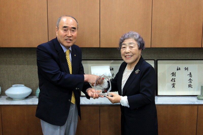 2017-08-22 작성자: 관리자 (주)동구바이오제약 앞 감사패 전달 (사)한국사랑나눔공동체는 의약품 후원에 대한 임원 및 회원의 감사의 마음을 담아 (주)동구바이오제약 이경옥 회장에게 감사패를 전달하였다.