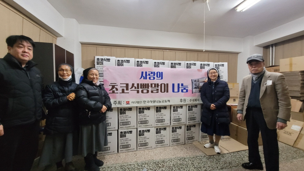 2026-01-26 작성자: 관리자 (주) 킹푸드 후원 초코식빵말이 가공식품 지원행사 2026년 1월 24일 사단법인 한국사랑나눔공동체 이은덕 이사장은 (주)킹푸드 최준웅 대표로 부터 초코식빵말이 가공식품 24,000개을 기부받아, 음성꽃동네 유지재단, 원각사 무료급식소, 아네스의집 등에 지원하는 행사를 가졌다. 킹푸드.jpg(276.99 KB)